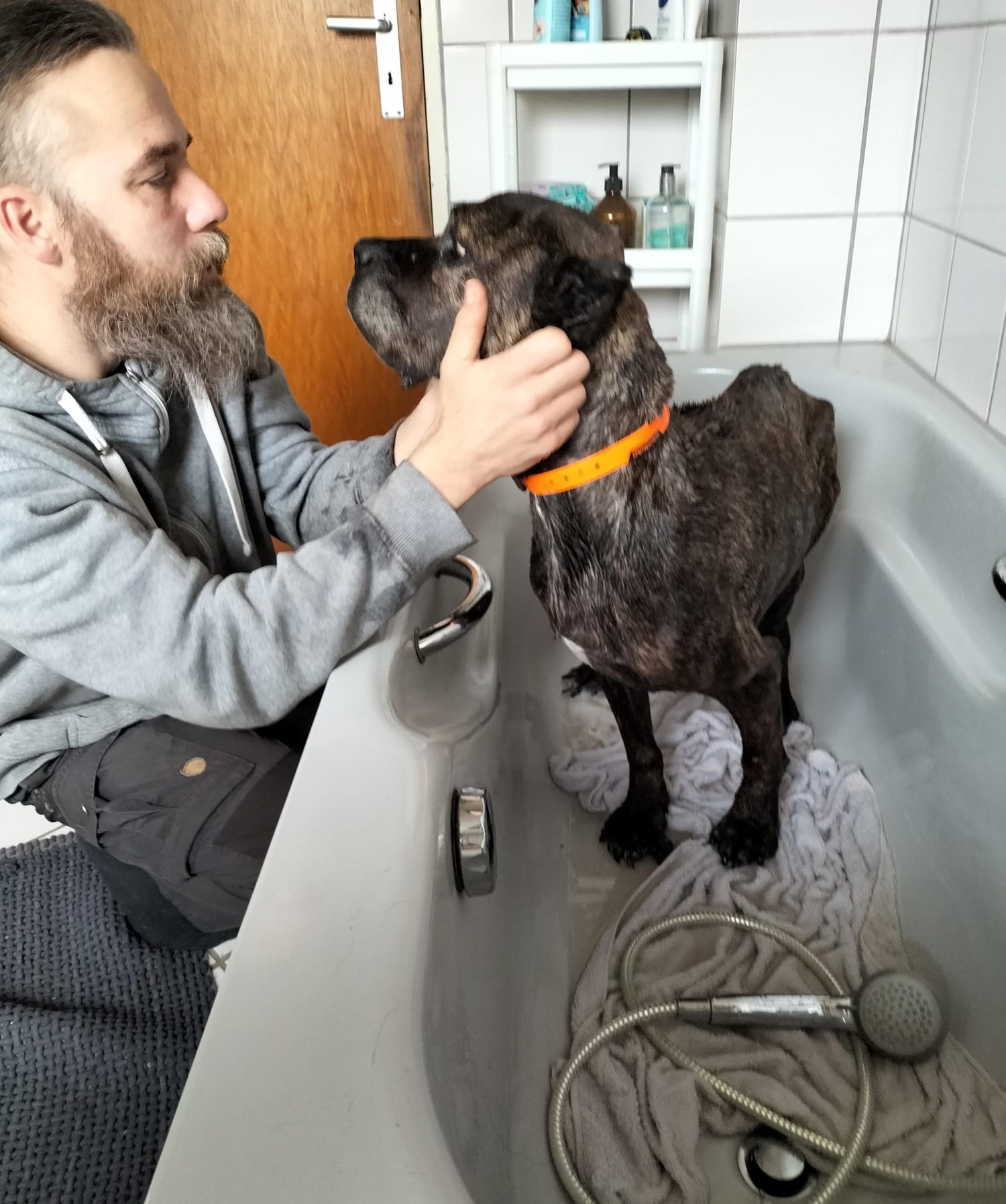 Boza kann mittlerweile „Sitz“- für ein Leckerchen sowieso. Nur das mit der Stubenreinheit hat er irgendwie noch nicht verstanden. Aber seine Pflegemama liebt ihn trotzdem heiß und innig. Aktuell wiegt er 35,5 kg – also gut 10 kg mehr als im Februar. Es geht langsam, aber sicher aufwärts. Das freut uns sehr und doch wiegt er immer noch zu wenig.