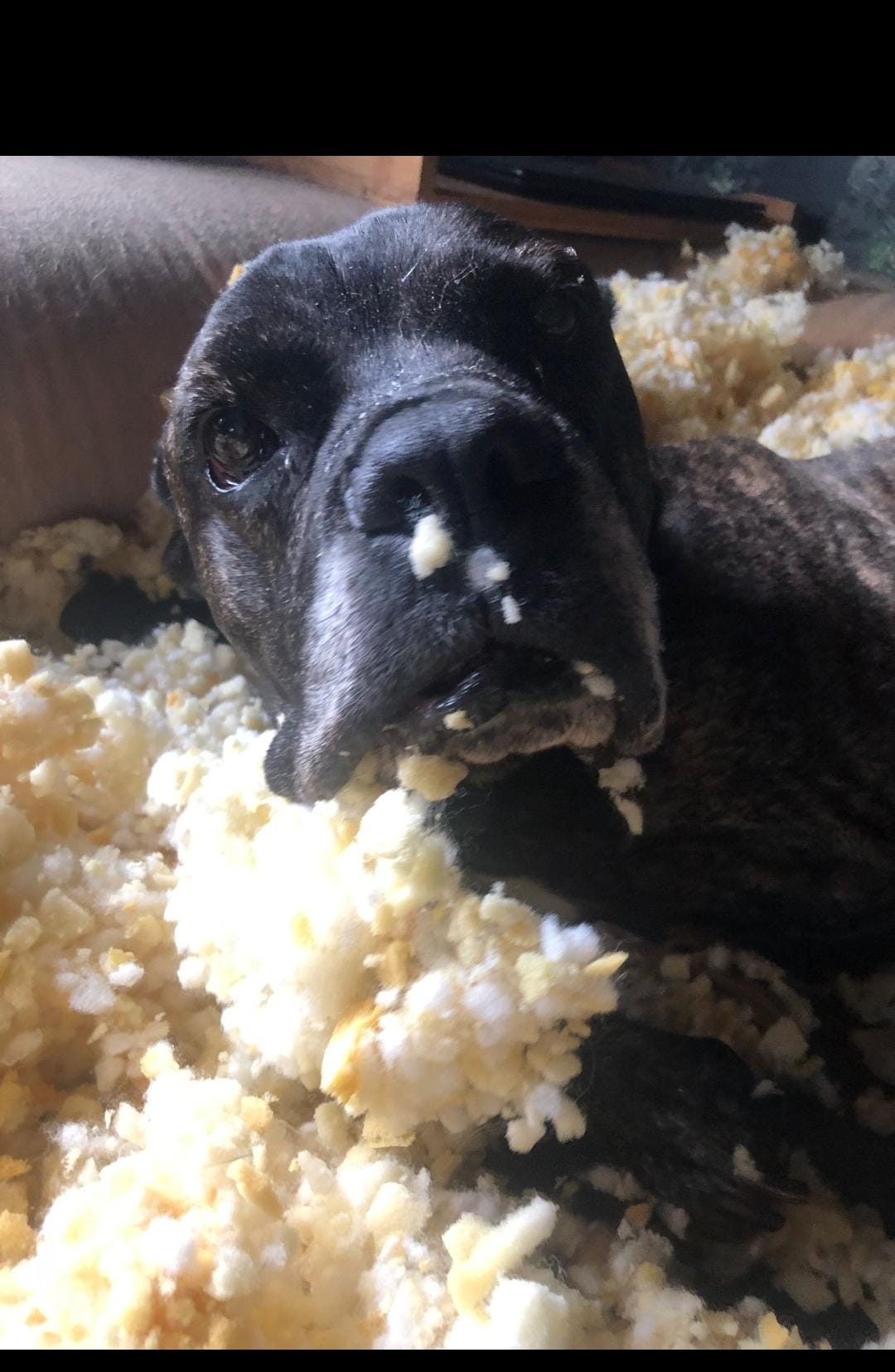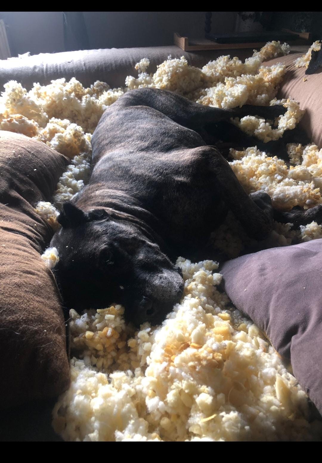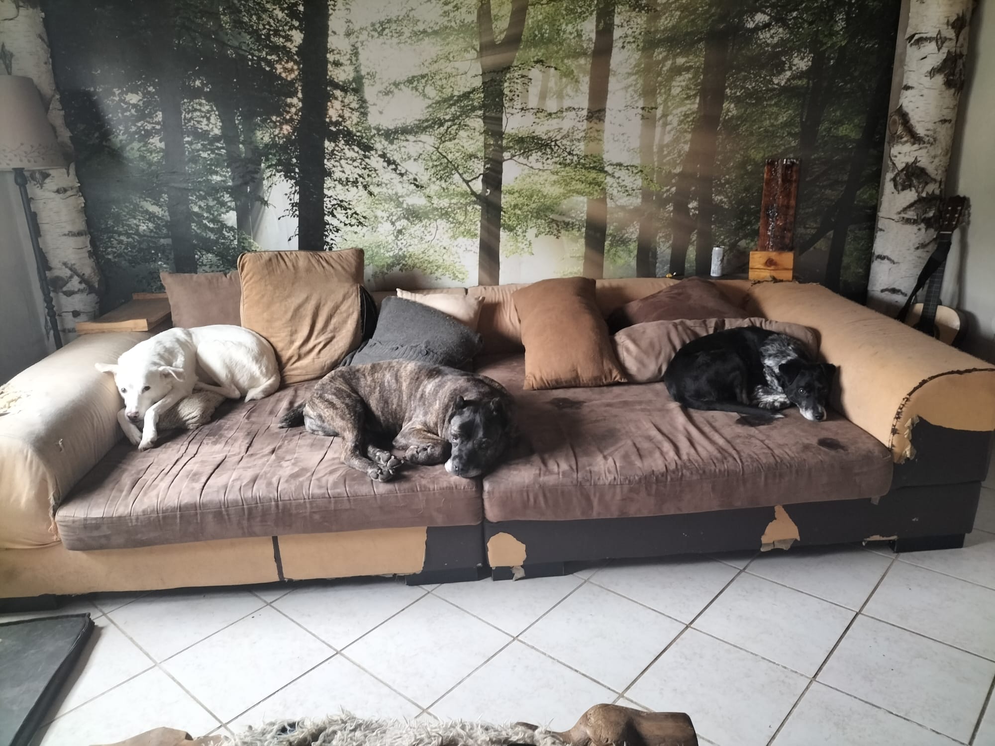 Sein Lieblingsplatz ist übrigens auf der Couch am Kamin. Nur wurde er da vor ein paar Wochen in einen kleinen Unfall verwickelt: in der Nacht ist doch tatsächlich ein Sofakissen explodiert. Boza und seine Hundekumpels haben das aber unverletzt überstanden. Und Boza fand, dass es sich auf der gleichmäßig verteilten Kissenfüllung viiieeel besser liegt. Leider war seine Pflegemama davon nicht ganz so begeistert und hat die ganzen Flocken – nach Sicherung durch entsprechende Beweisfotos – weggeräumt.