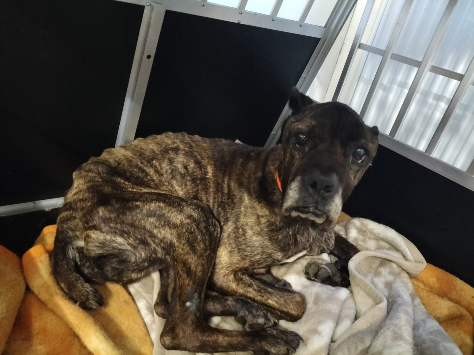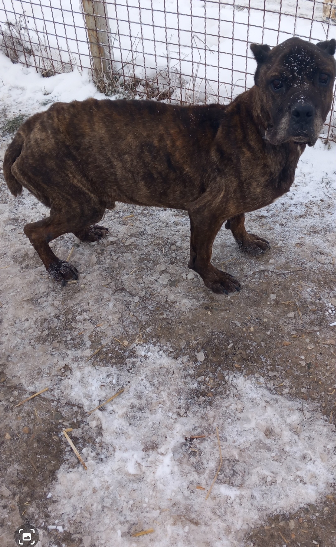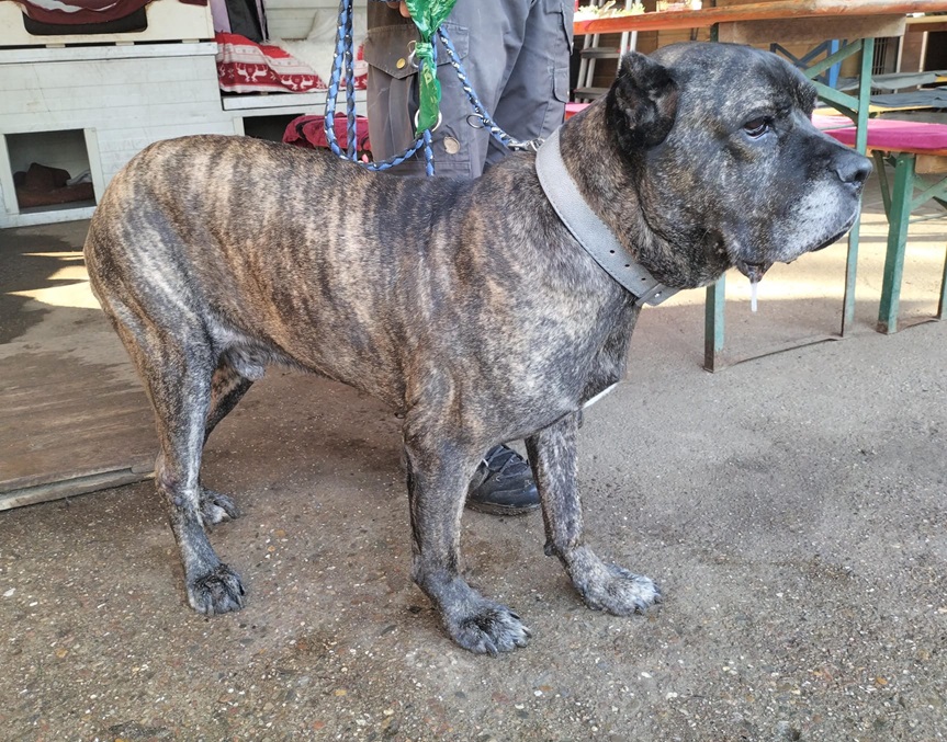 Boza kam in einem sehr schlechten Zustand zu uns. Total abgemagert (25 kg bei einer Größe von 60 cm), kaum Muskeln, schuppige Haut. Nach ein paar Tagen stellte sich heraus, dass er mit dem Trubel im Tierheim nicht gut klarkommt. Er kam nicht wirklich zur Ruhe und hatte massiven Durchfall. Eine Mitarbeiterin hat ihn dann mit nach Hause genommen, damit er dort zur Ruhe kommt und sie sich intensiver um seine Pflege kümmern konnte.