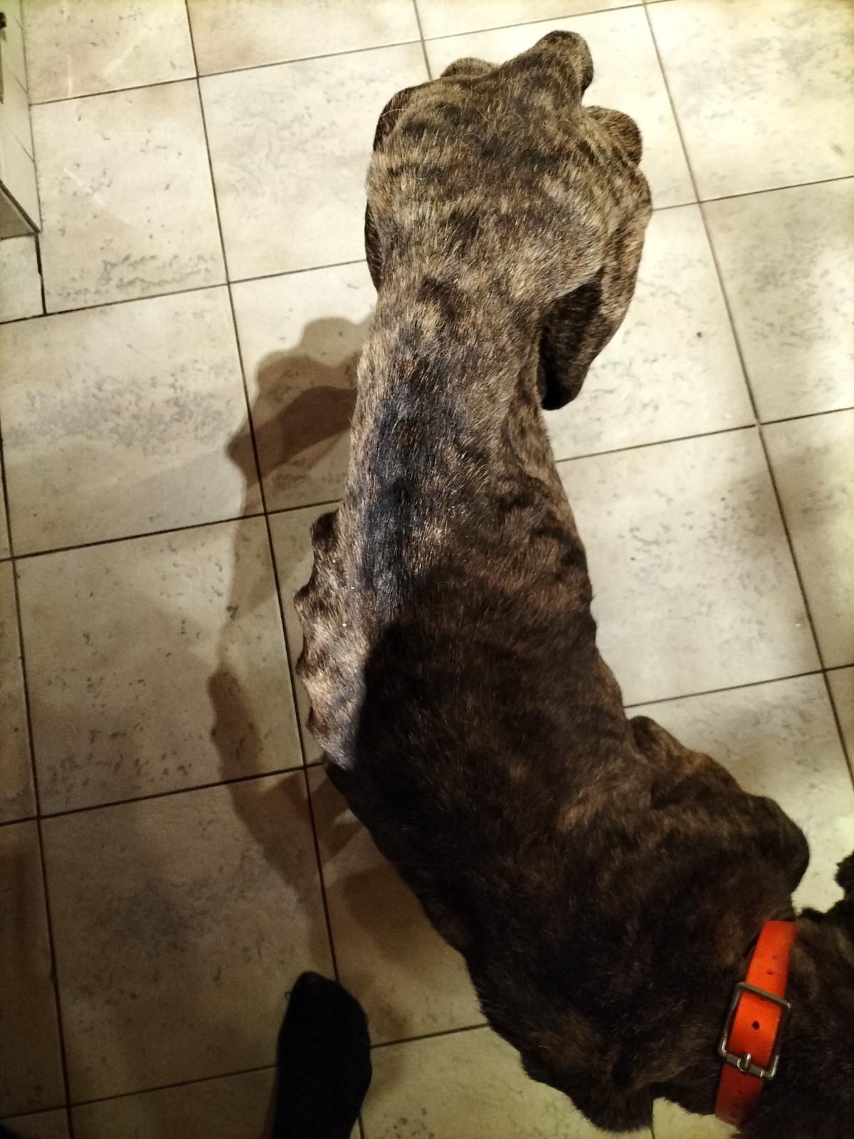 Selbst unsere Hündin Kira, die eigentlich vor Nichts Angst hat, hatte vor seinem Aussehen Angst. Wir haben Boza mit sehr viel fettreichem Futter gefüttert und ihm Pulver für die Bauchspeicheldrüse gegeben. Und langsam hat er zugenommen und Muskeln aufgebaut.