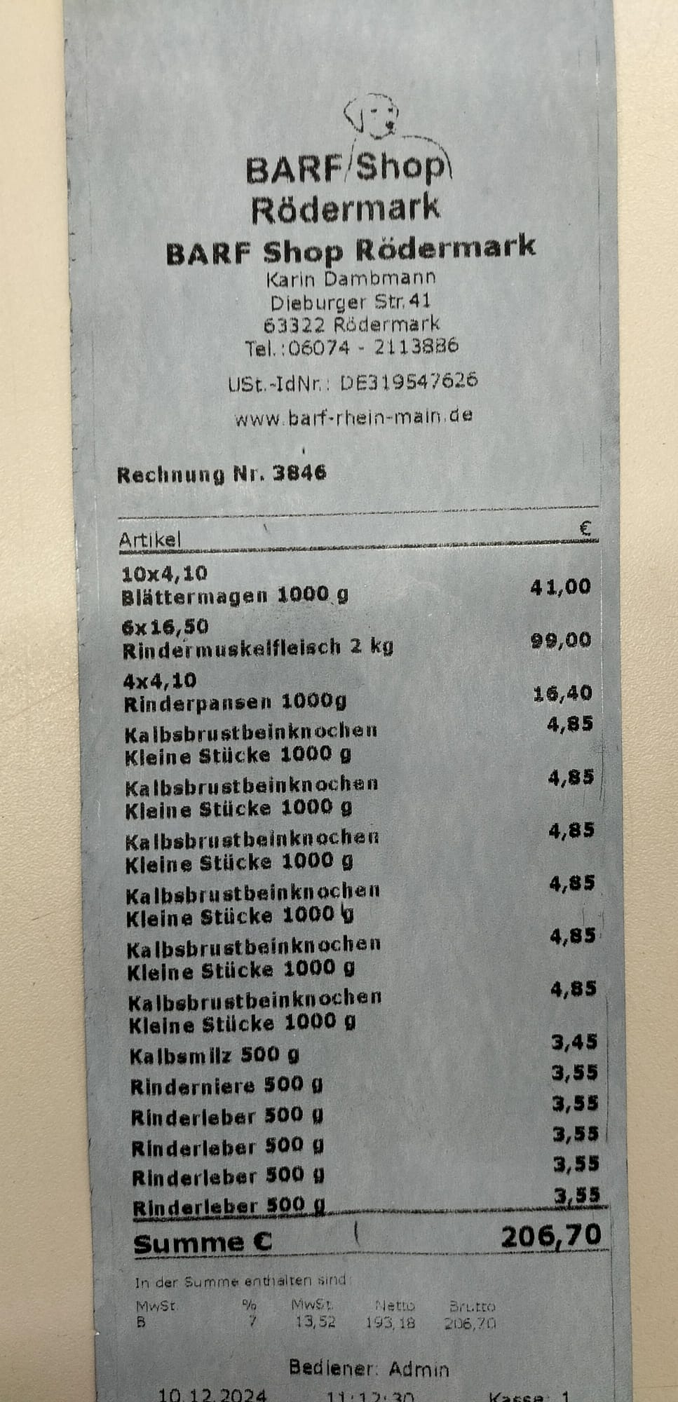 Bozas Barfmahlzeiten und Nahrungsergänzungen können verständlicherweise nicht aus Futterspenden gedeckt werden. Die Menge auf dem Kassenbeleg unten reicht für ca. 3 Wochen. Da seine Pflege also weiterhin sehr kostenintensiv ist, die Pflegestelle aber nicht über die finanziellen Mittel verfügt, sind wir dankbar für die Patenschaften.